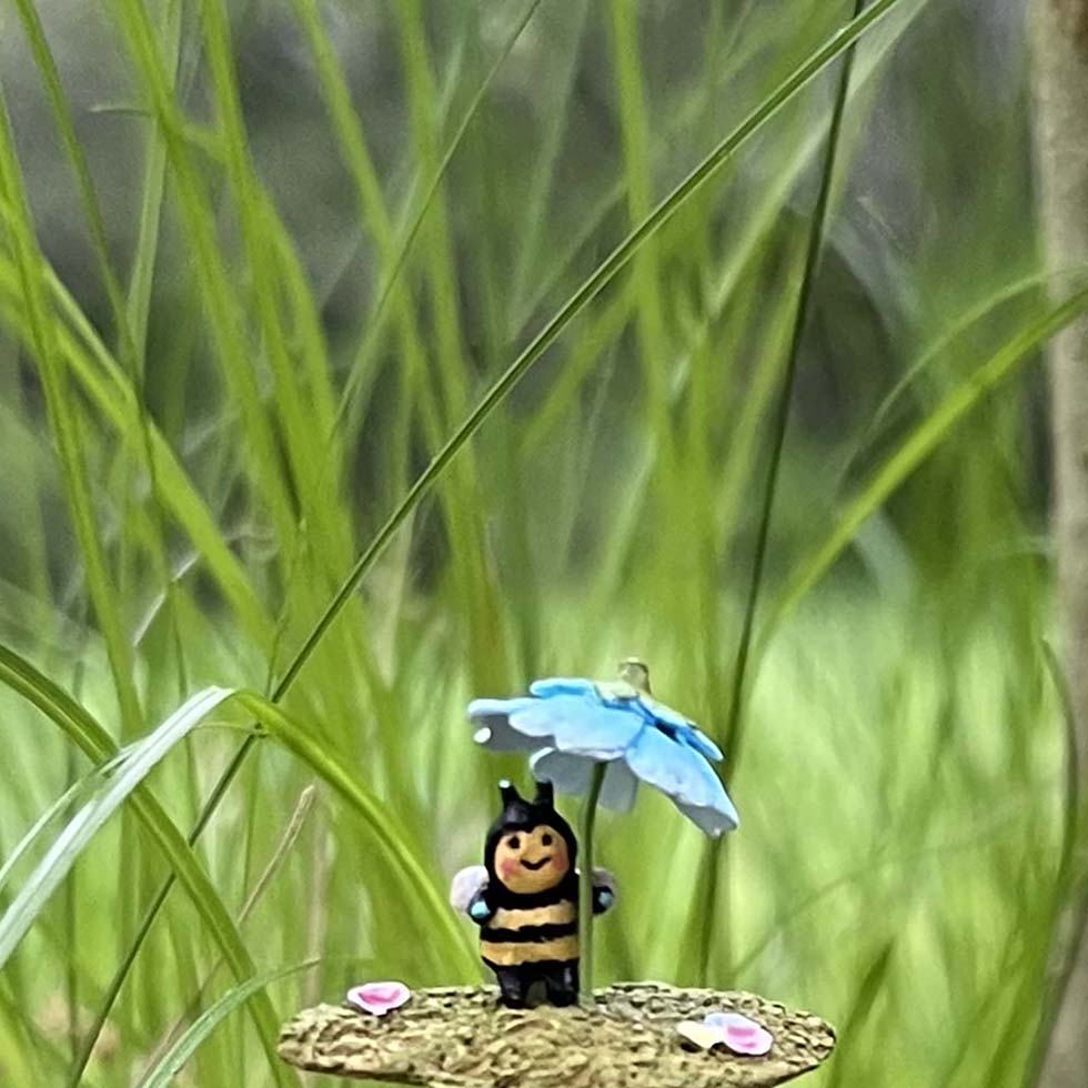 To what does our little bee cling? Why it looks like a beautiful blossom of spring! Comes in purple, blue, pink and yellow. Limited until September 15, 2025. Sculpted by Donna. .875" x .75"